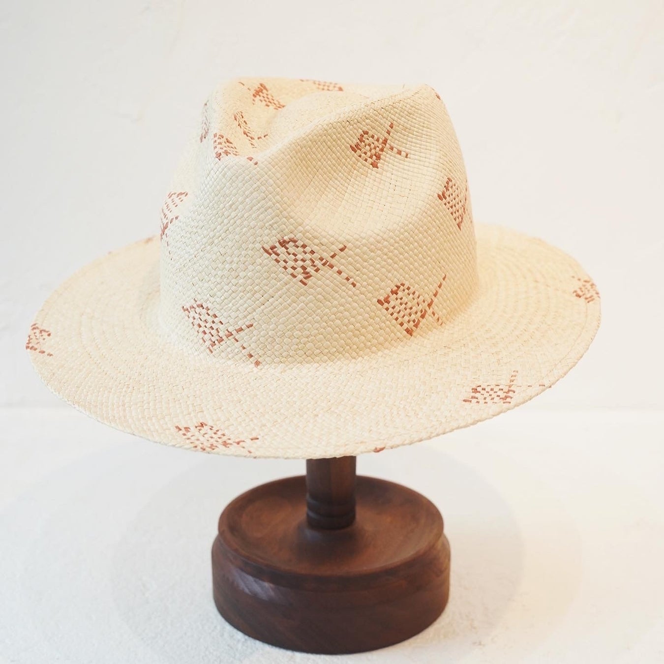 柄網がお魚模様にもみえる中折れのパナマハット。