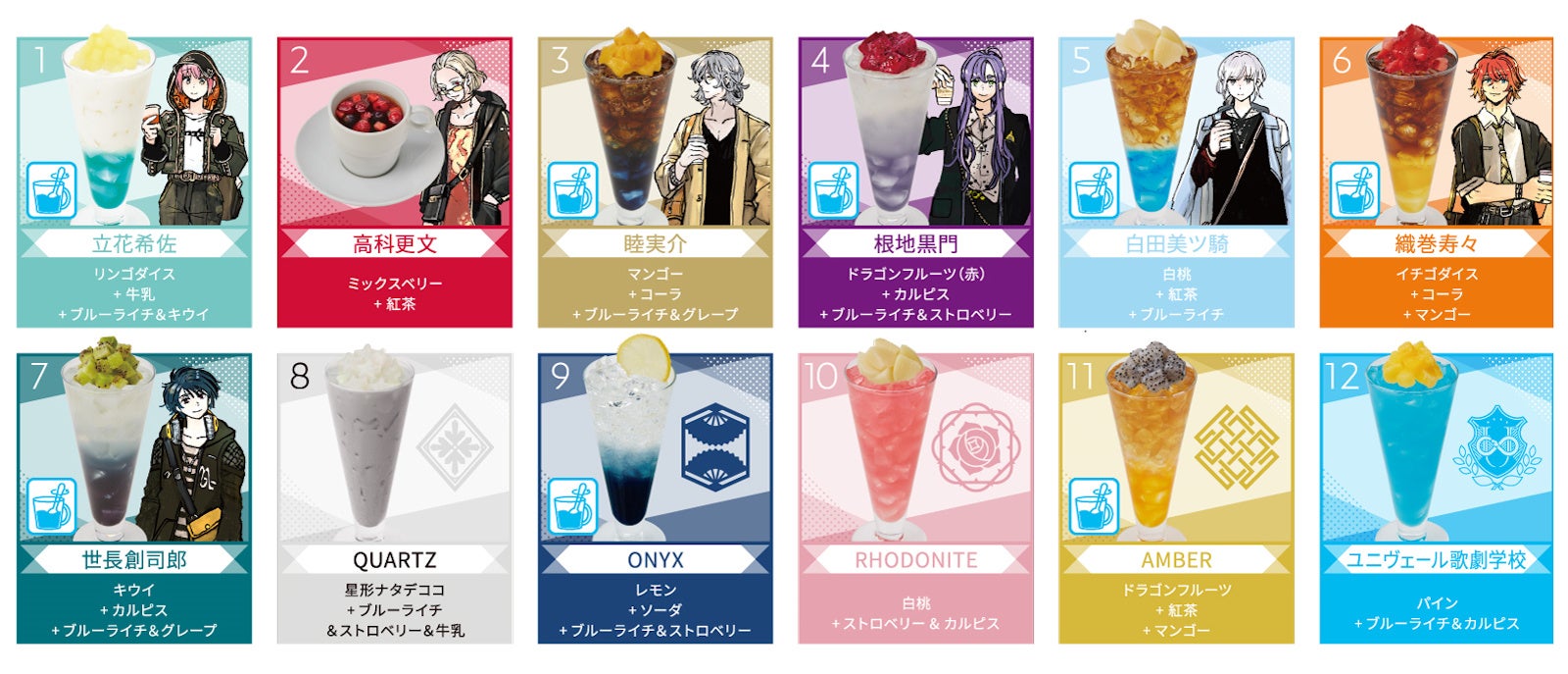 コラボドリンクは、クオーツ生の「立花希佐」「高科更文」「睦実介」「根地黒門」「白田美ツ騎」「織巻寿々」「世長創司郎」と、各クラス「QUARTZ」「ONYX」「RHODNITE」「AMBER」および、「ユニヴェール歌劇学校」をイメージした全12種をご用意します。