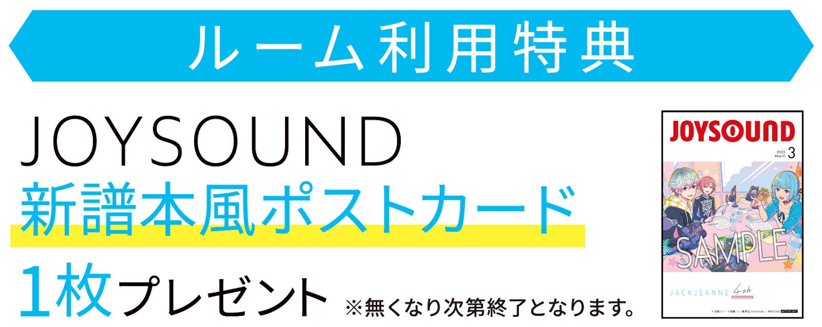 また、コラボルームのご利用特典として、JOYSOUNDオリジナル新譜本風ポストカードを1枚プレゼントいたします。