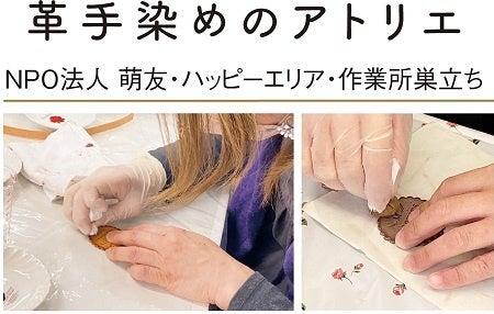 制作は、「NPO法人 萌友」さん、「ハッピーエリア」さん、「作業所巣立ち」さんです。革手染のような細かな作業を得意とするチャレンジドのみなさんが、ひとつひとつていねいに染めています。布をしみ込ませた革用染料を、ビスケット型に抜いたヌメ革の端から少しずつたたくように染めていきます。おいしそうな焼き具合を想像しながらていねいに染めています。