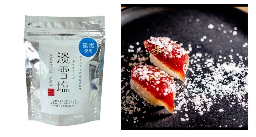 瀬戸内海の海水に“海人の藻塩”エキスを配合して作った藻塩と国産米粉を、繊細なフレーク状にした新しい形の飾り塩です。口どけの良いまろやかな塩味と豊かな旨み、見た目の美しさで、料理を魅せる新たな調味料が誕生しました。