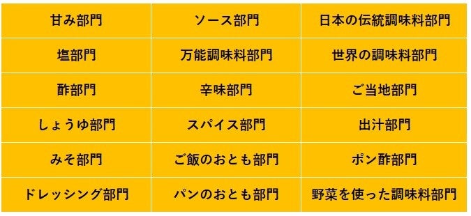 最終審査エントリーを通過した全55品目を部門別に分けると、全部で18種類にジャンル分けされます。「甘み部門」や「塩部門」をはじめ「パンのおとも部門」、「万能調味料部門」など、思わず集めたくなる調味料がずらりと並びます。