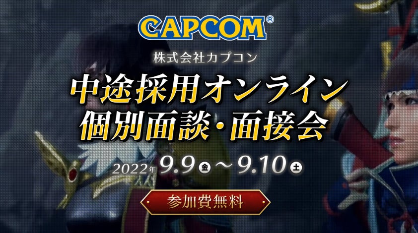 株式会社クリーク・アンド・リバー社(C&R社)は9月9日(金)・10日(土)の2日間、ゲームクリエイターを対象に、株式会社カプコンの中途採用オンライン面談・面接会を開催いたします。