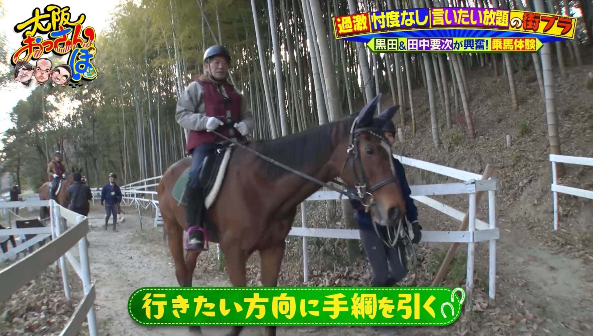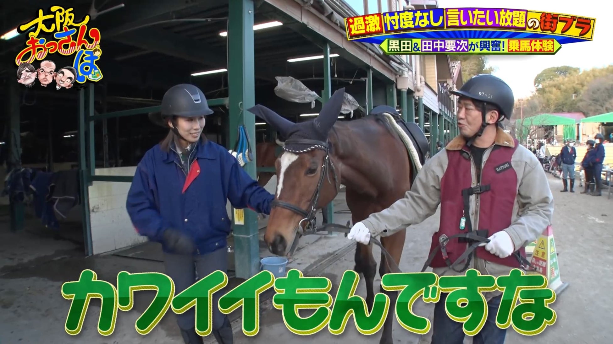 一行がたどり着いたのは、公園の敷地内にある乗馬クラブ「服部緑地乗馬センター」。ここで乗馬体験ができるということで、黒田と田中が挑戦。乗馬に興味を持った黒田は「56歳ですけど今からでもいける?」「僕、運動神経悪いんですよ。あと痛風なんですわ」とスタッフを質問攻めに。