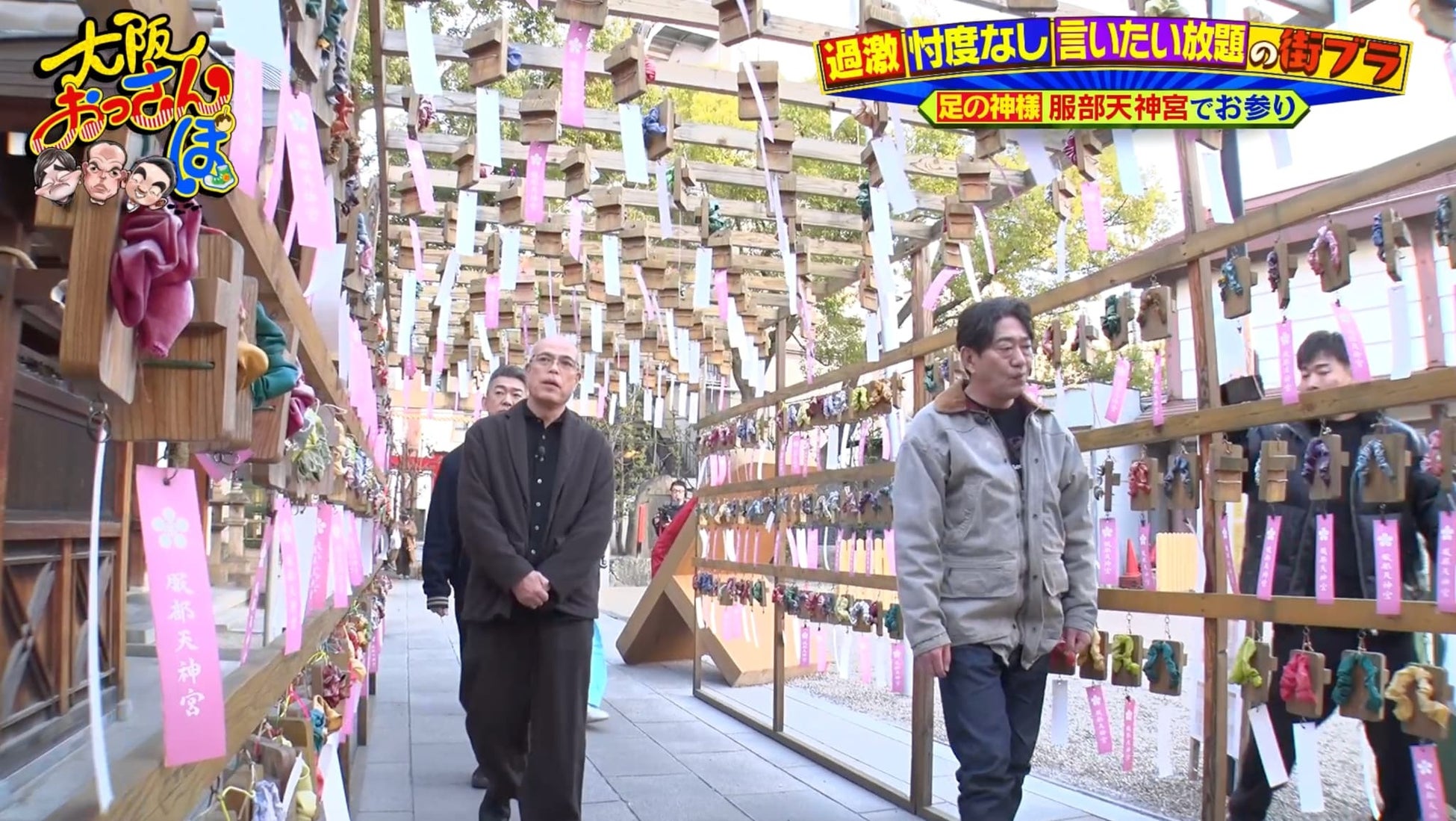 お次は橋下の案内で、“足の神様”を祀る「服部天神宮」へ。田中は時代劇での正座するシーンで「膝に激痛が走った」と言い、黒田は「痛風」、橋下も昨年から足腰を痛めていることから、3人でお参り。