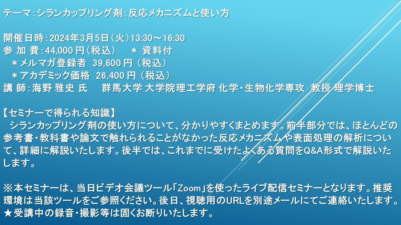 【ライブ配信セミナー】シランカップリング剤:反応メカニズムと使い方 3月5日(火)開催 主催:(株)シーエムシー・リサーチ