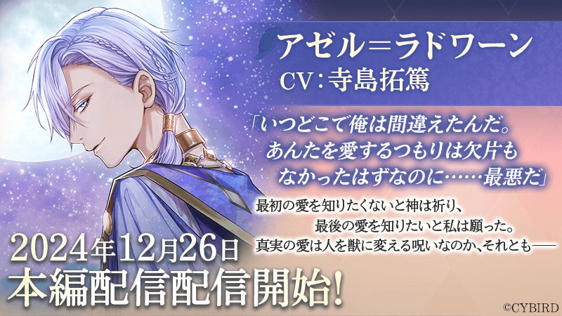 株式会社サイバード(本社:東京都渋谷区、代表取締役社長 兼 CEO 長嶋 貴之)が手掛ける、全世界でのシリーズ累計会員数4,000万人を誇る大人気恋愛ゲーム「イケメンシリーズ」の人気作『イケメン王子 美女と野獣の最後の恋』(以下、『イケメン王子』)は、「アゼル=ラドワーン(CV:寺島 拓篤)」(以下、「アゼル=ラドワーン」)の本編を、2024年12月26日(木)より配信開始しました。