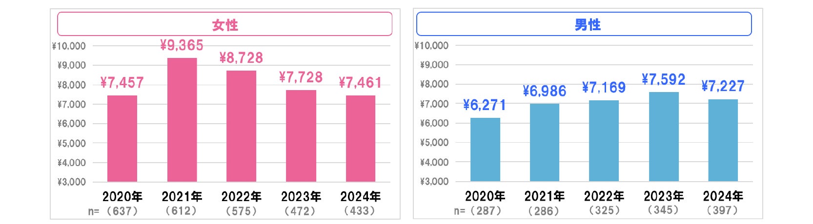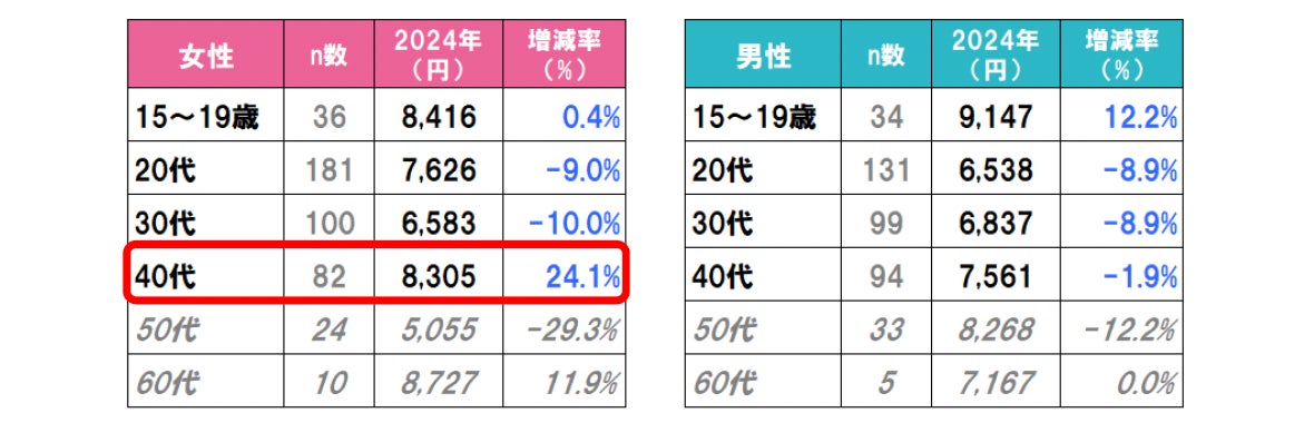 女性の利用金額は2021年以降、低下傾向だが、40代は前年から24.1%上昇し8,305円に。