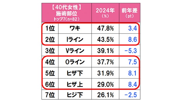 1回あたり利用金額が大きく上がった40代女性のトップ7では、ほとんどの施術部位が前年を上回っている。