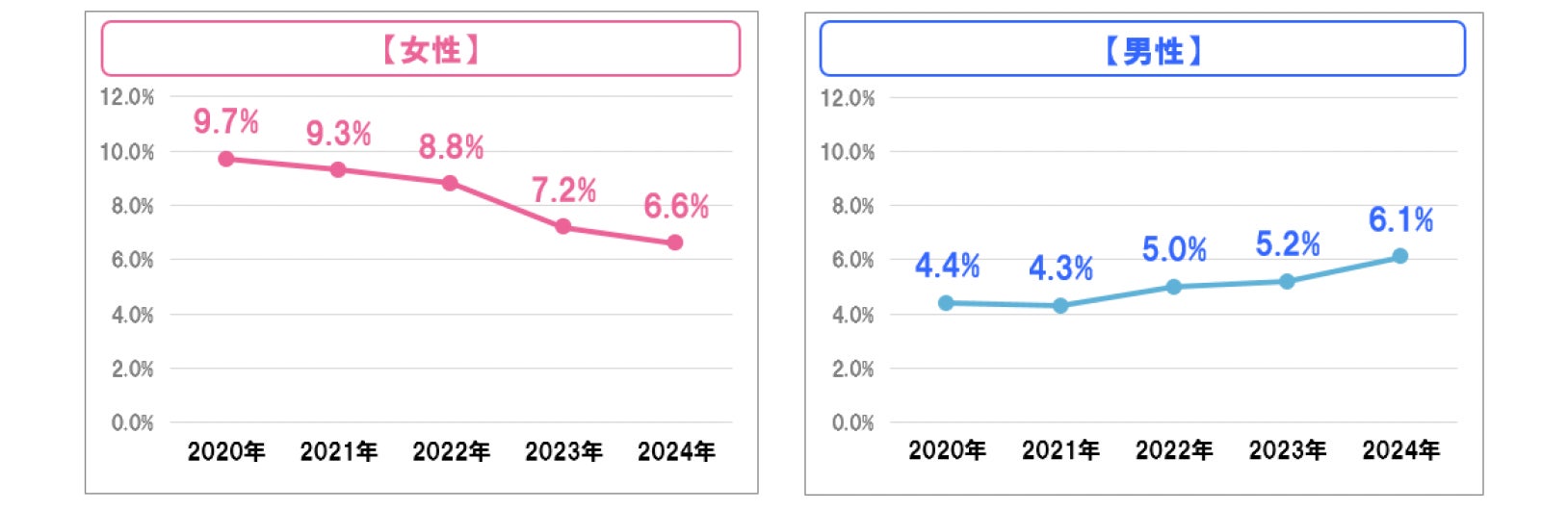 女性の利用率が減少傾向で、男性の利用率が増加傾向。
