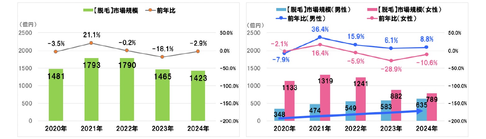 男性の脱毛市場が拡大。2024年は635億円で、4年で約1.8倍に。男性の「Vライン」脱毛が増加し、「ひげ」脱毛にほぼ並ぶ