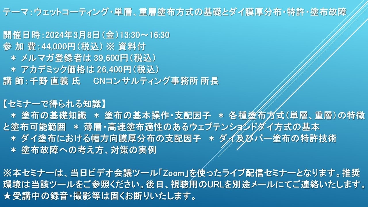 【ライブ配信セミナー】ウェットコーティング・単層、重層塗布方式の基礎とダイ膜厚分布・特許・塗布故障 3月8日(金)開催 主催:(株)シーエムシー・リサーチ