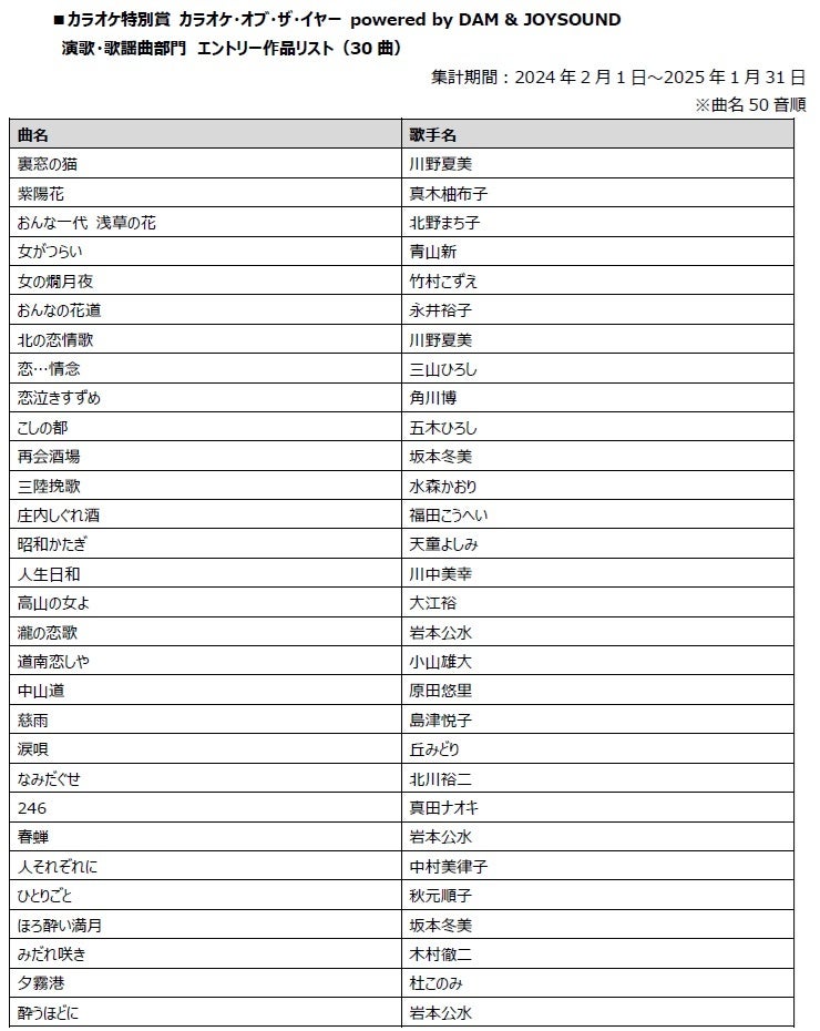 【カラオケ・オブ・ザ・イヤー:演歌・歌謡曲部門】カラオケで最も歌われた演歌・歌謡曲が対象