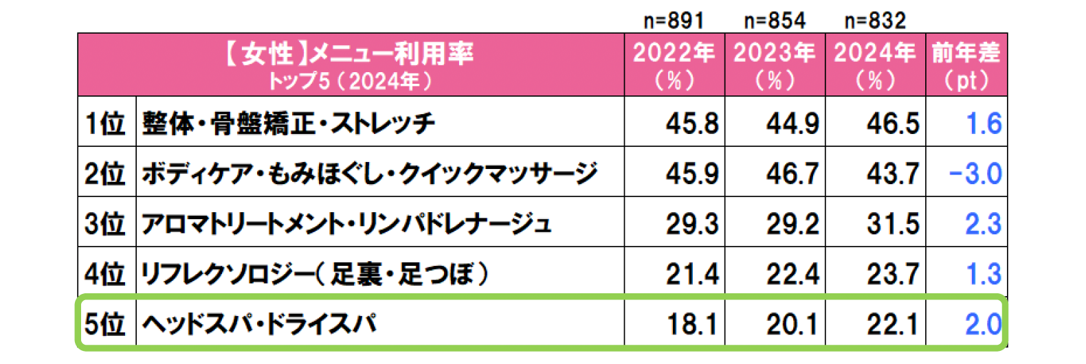 男女の「ヘッドスパ・ドライスパ」の利用率が2年連続で増加。(P3-4)