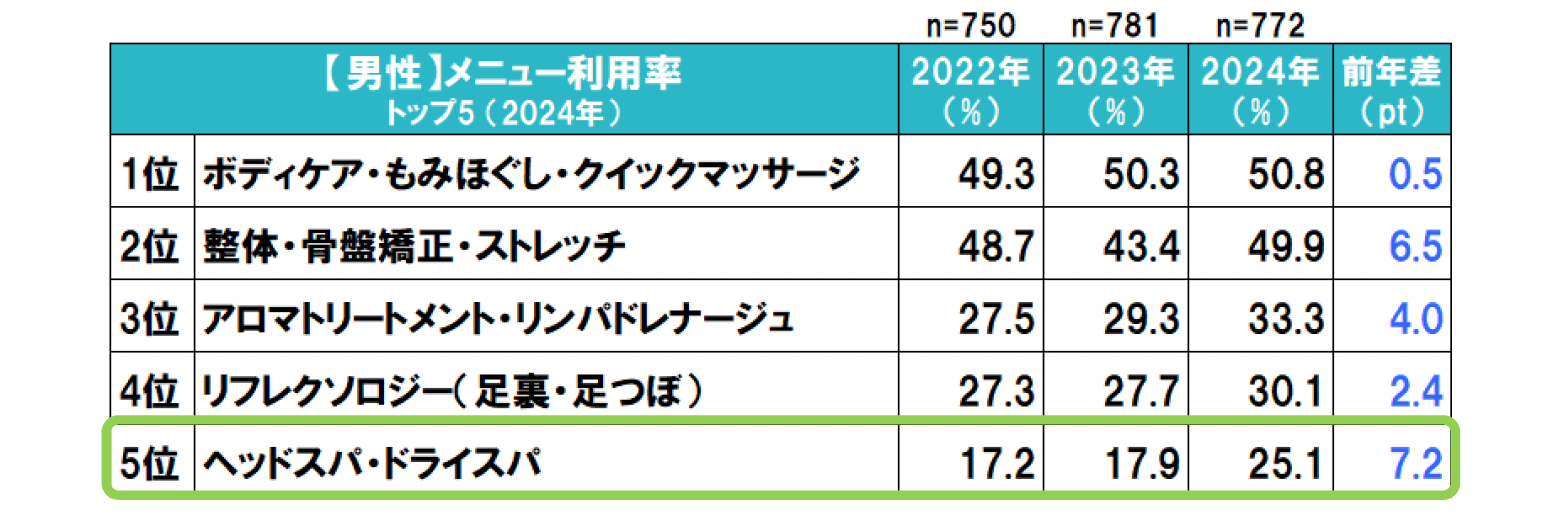 男女の「ヘッドスパ・ドライスパ」の利用率が2年連続で増加。男性は前年から7.2ポイント増加。
