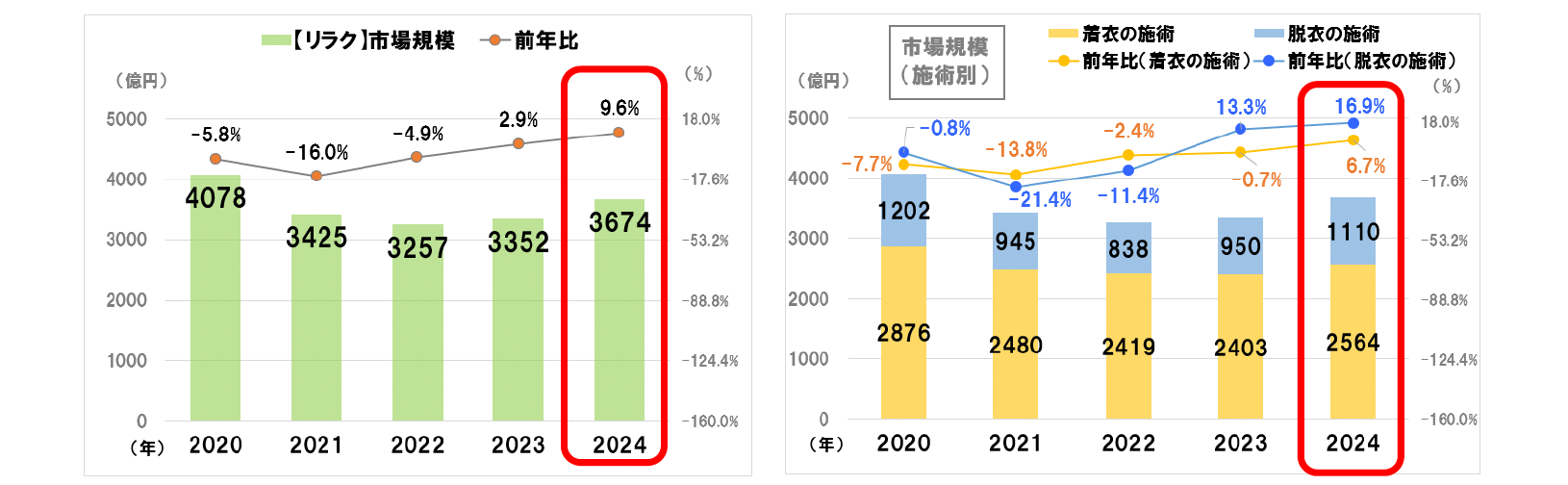 リラクゼーションサロンの市場規模は3674億円で、2年連続拡大。コロナ禍で大きく落ち込んだ【脱衣の施術】が復調の傾向