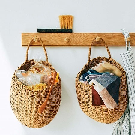 ループが付いた、天然素材風の手編みバッグの収納です。