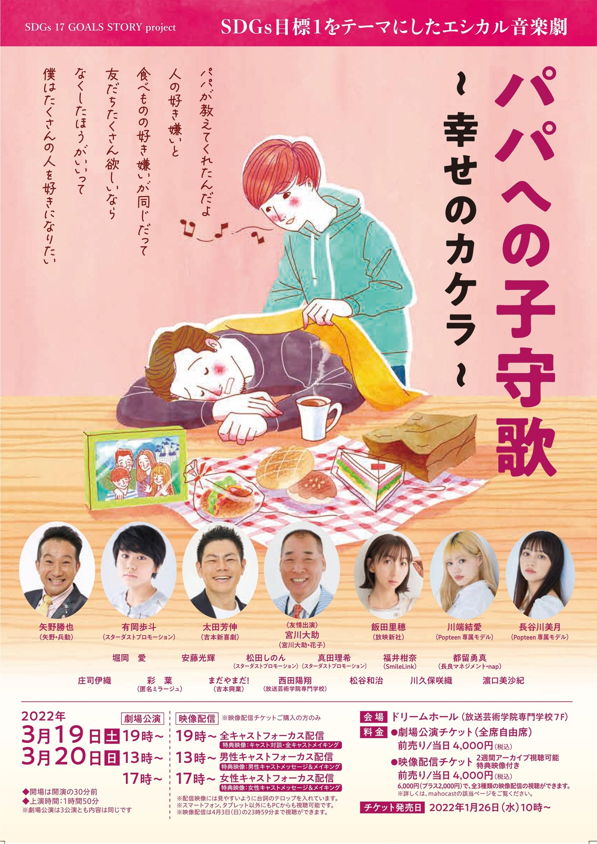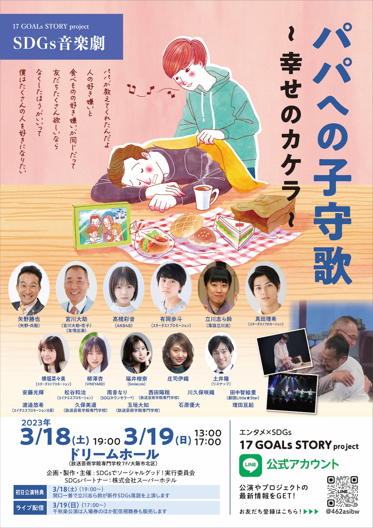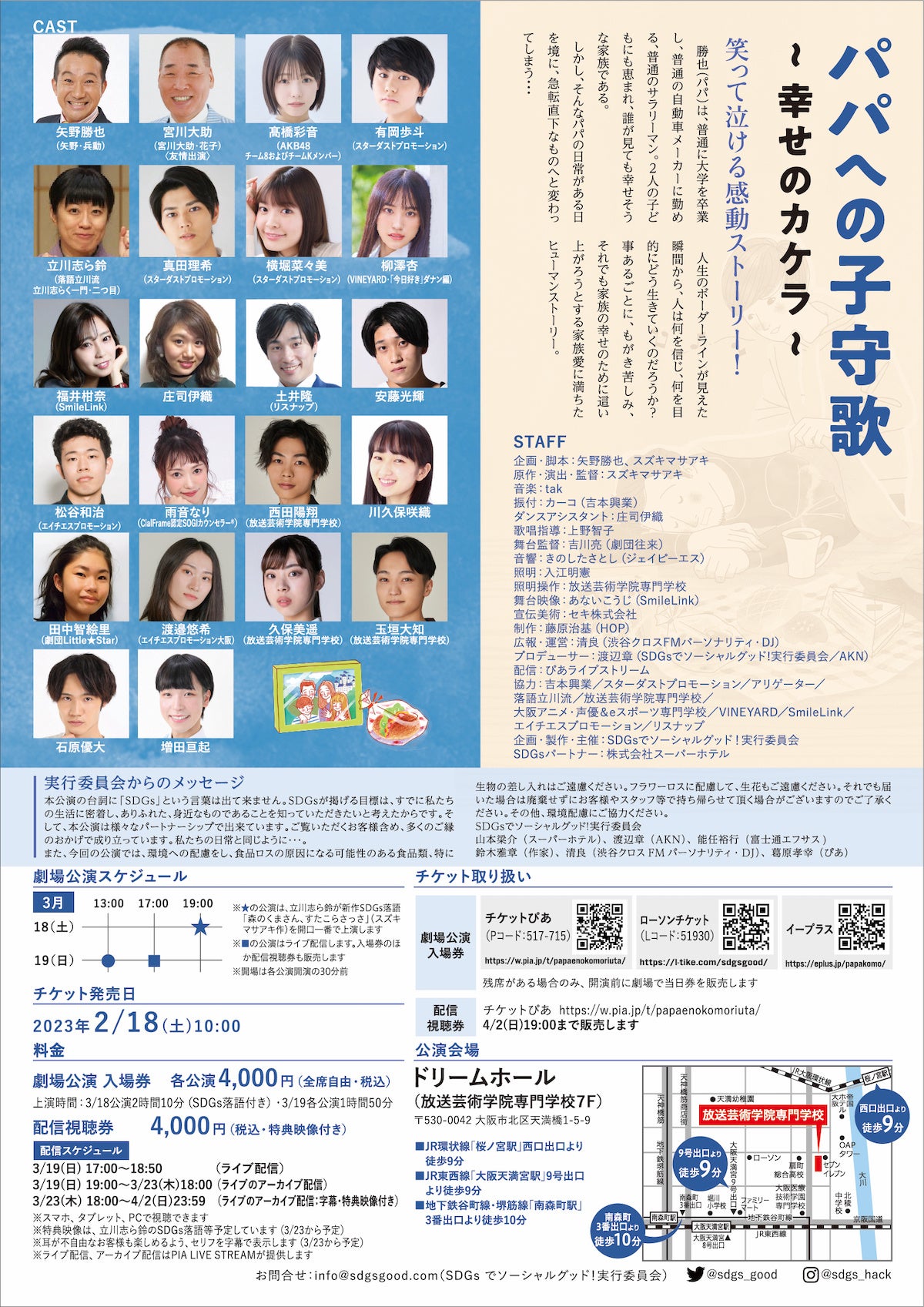 SDGs音楽劇「パパへの子守歌〜幸せのカケラ〜」を2023年3月18日(土)と19日(日)に放送芸術学院専門学校7F・ドリームホール(大阪市北区)で開催します。昨年3月の初演に引き続き、矢野勝也(矢野・兵動)、宮川大助(宮川大助・花子)らが再出演するほか、髙橋彩音(AKB48)、立川志ら鈴(落語立川流)など新たな出演者もむかえて開催します。また、3月18日の初日限定で、立川志ら鈴がSDGs落語「森のくまさん、すたこらさっさ」を披露します。チケットぴあで劇場入場券、動画配信視聴券ともに発売中です。