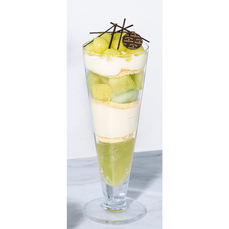 メロンゼリー、メロンソルベ、ホワイトチョコレートムース、スポンジを層にして旬なフレッシュメロンをごろごろと挟んだパルフェです。