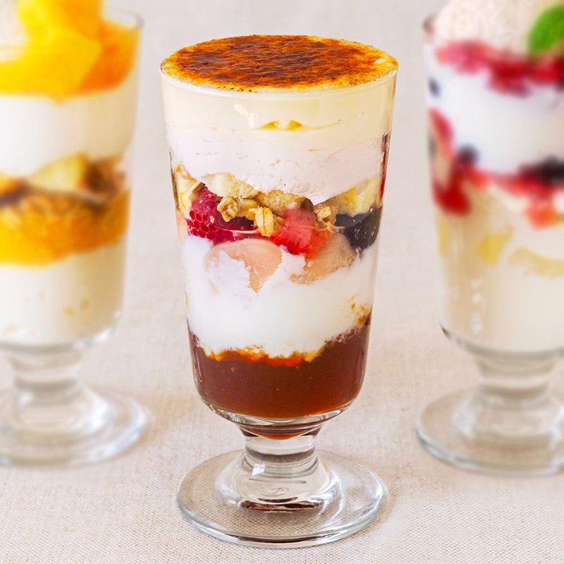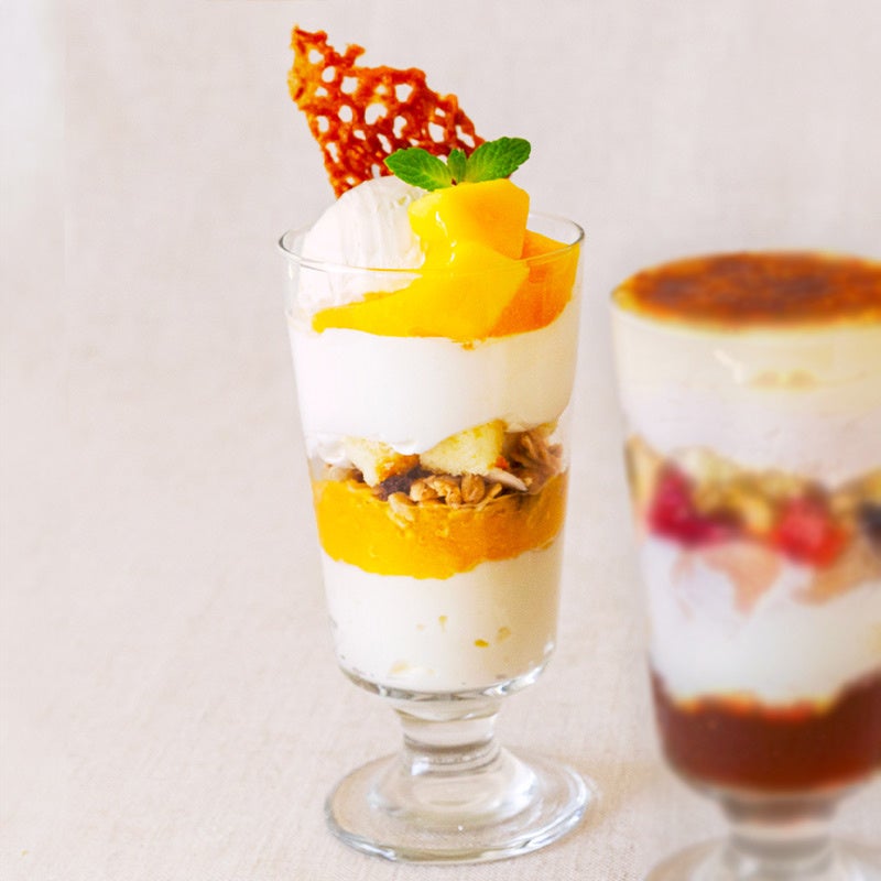 白桃と黄桃を贅沢に使い、白桃アイス・紅茶ゼリー・フロマージュブランを合わせ、ブリュレ風に仕上げました。