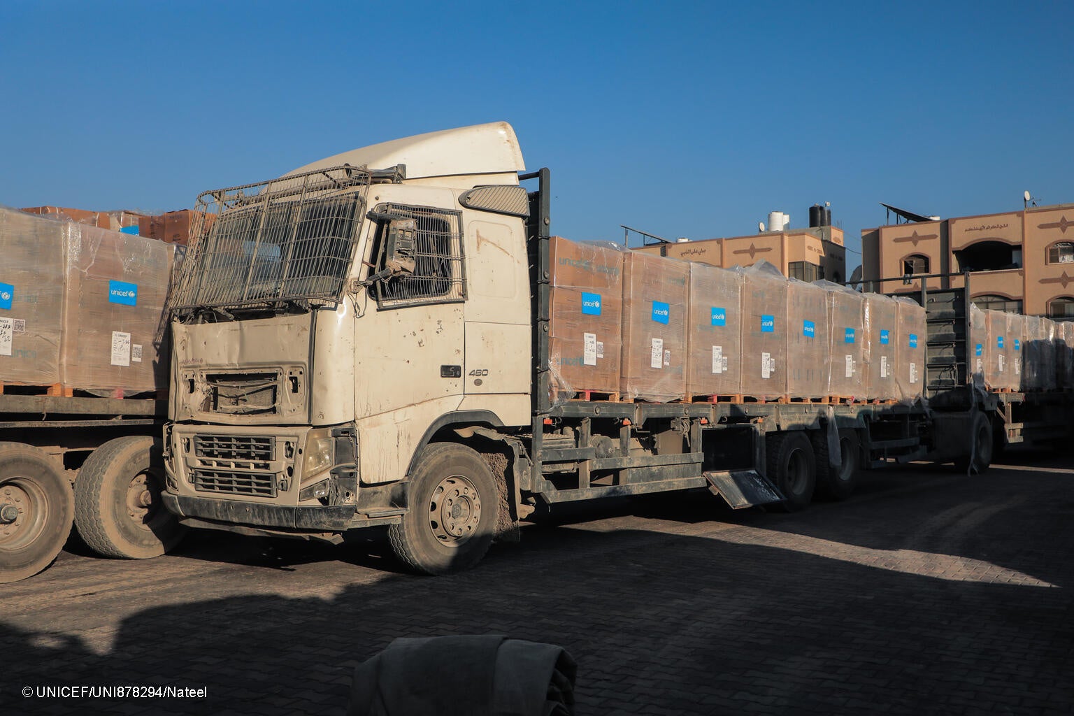 ユニセフは1,300台以上のトラックに、テント、栄養に関する物資、必要不可欠な医薬品やワクチン、学習・遊びのキット、そして水と衛生用品を積んで待機させています。現地には、子どもたちの人生をより良くするために尽力を続けるユニセフのスタッフとパートナーたちがいます。すべての当事者は、国連の人道支援活動が即時かつ安全に、そして大規模に再開できるよう、確実に保障しなければなりません。