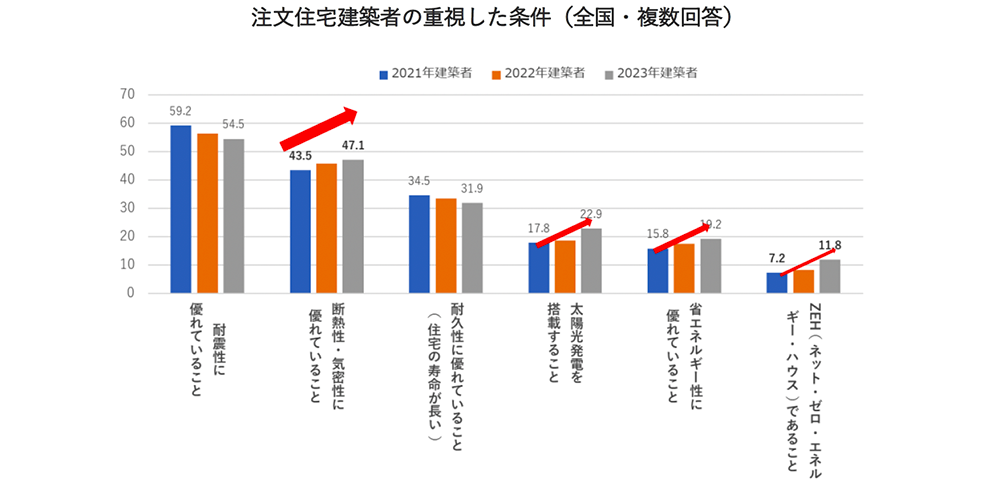 全国の注文住宅の建築者に、建築する際に重視した条件を聞いたところ、「断熱性・気密性に優れていること」が、「耐震性に優れていること」に次いで、2位となりました。また、「断熱性・気密性に優れていること」は、毎年数値を伸ばしています。