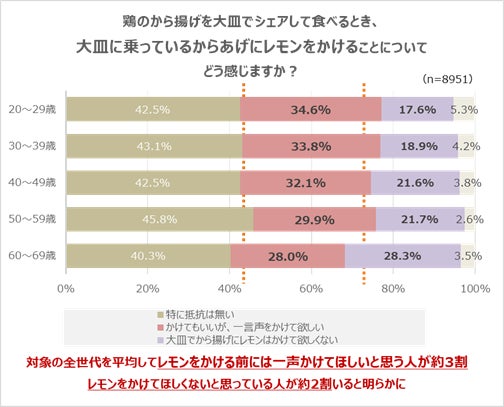 ・からあげを大皿でシェアして食べるときに、大皿に乗った状態のからあげにレモンをかけることについて、「特に抵抗はない」43.0%「かけてもいいが、一言声をかけて欲しい」31.4%(合計74.4%)と、多くの方は肯定的な見方をしていることも分かりました。