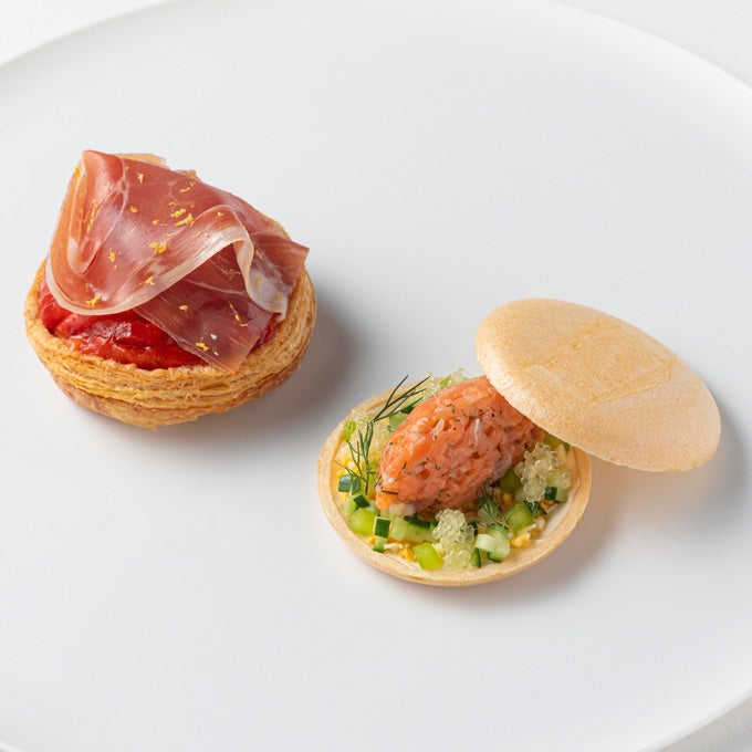 加山シェフ監修“サーモンマリネとサルピコンのモナカ”と“レモン風味のピペラードと生ハムのタルト”