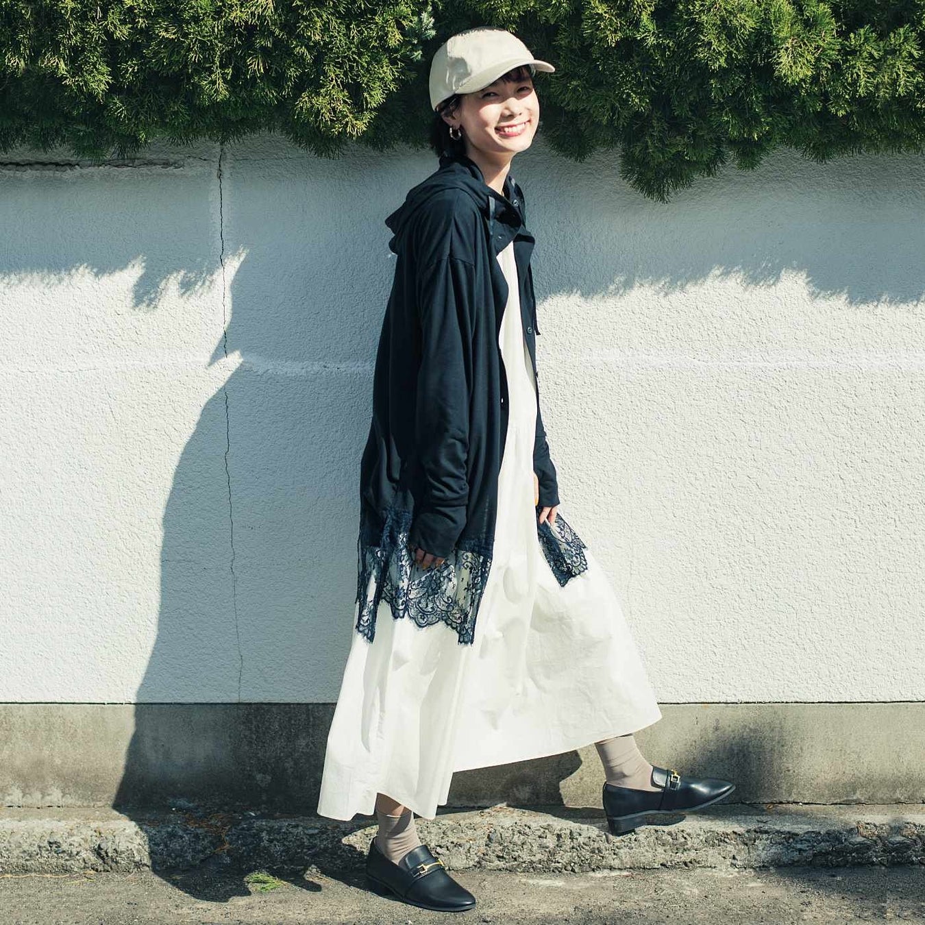 華やかなレースをあしらった日除けUVパーカーです。薄手で軽く、たたんでバッグに入れられるので、携帯にも便利です。吸水速乾加工かつUV90%カットで、首もとや手の甲の日差しも対策できます。
