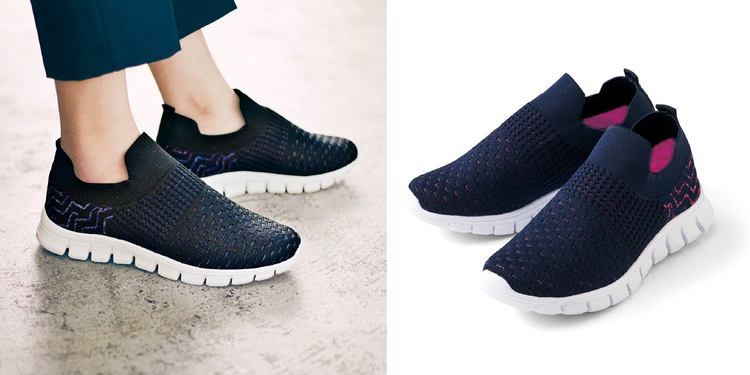 屈曲性のあるソールと、厚みのある約1cmのインソールで疲れにくい、ふだんの洋服にあわせやすいシンプルなデザインのニットスニーカーです。ニット素材でよくのび、足取り軽く、いつもよりたくさん歩きたくなるようなスニーカーです。