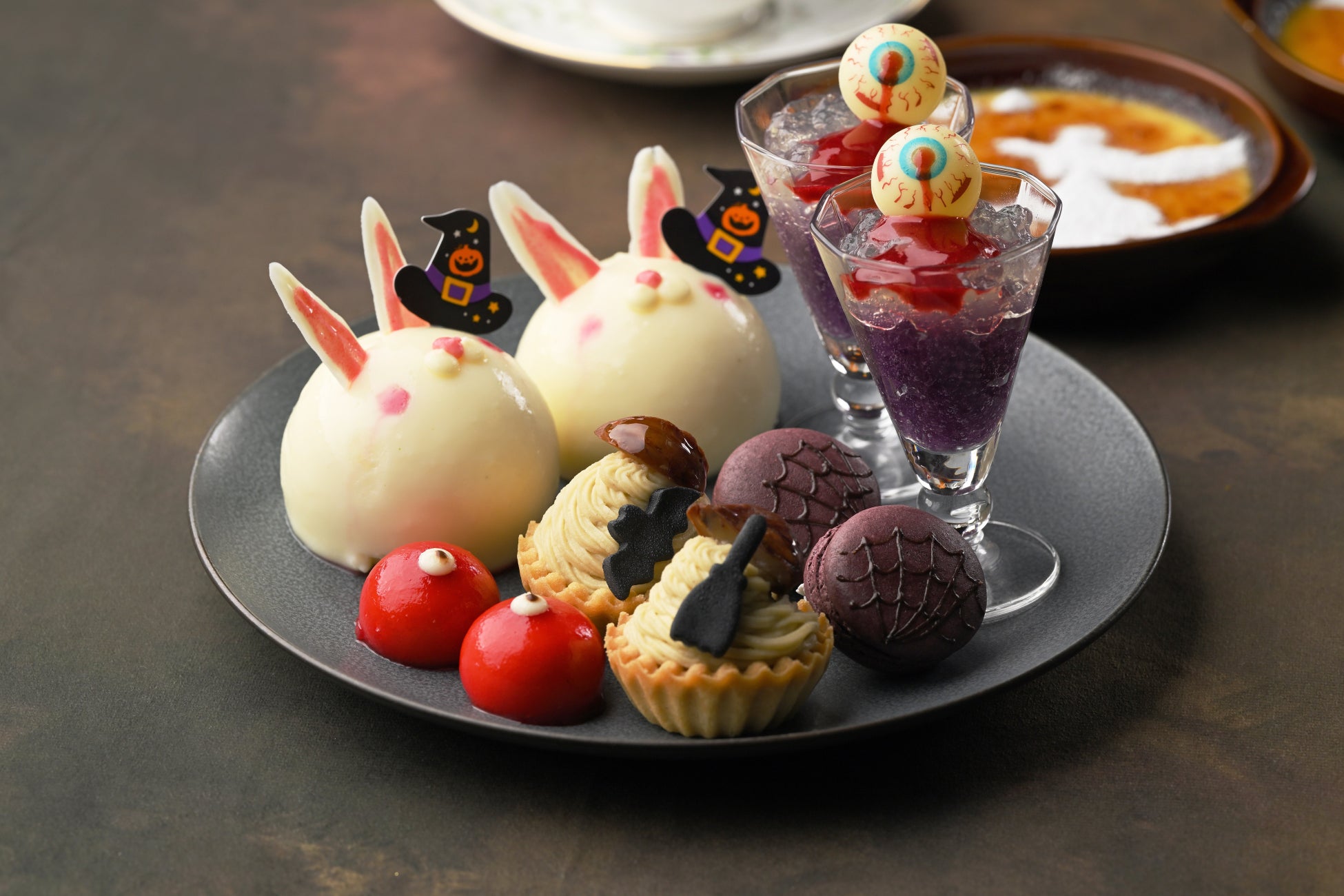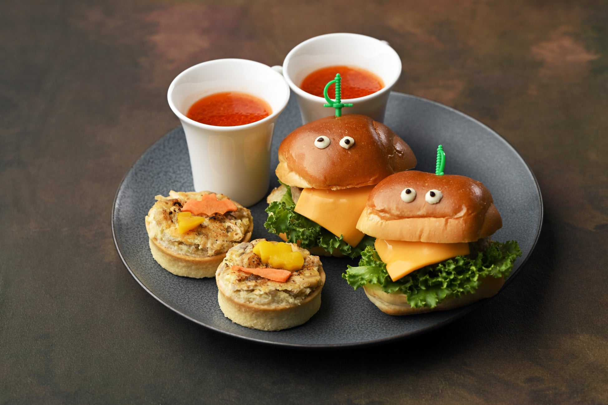 ぶどうのジュレに白ワインジュレを組み合わせ、インパクトたっぷりの目玉チョコレートを飾った「目玉ヴェリーヌ」や滋賀県産の安土はちみつを使用した「フランケンフィナンシェ」、滋賀県産牛乳を使用して焼き上げ、生クリームで牙をかたどった「ビーツスコーン」、チーズで「あっかんべー」をするキュートなおばけの表情を表現した「おばけバーガー」など、スイーツからセイボリーにいたるまでポップで少し不気味なモンスターをモチーフにしたメニューに加え、焼き栗のシロップをかけて楽しむウエルカムドリンクや紅はるかのスコーンなど、秋の味覚を味わえる品々をご用意いたします。
