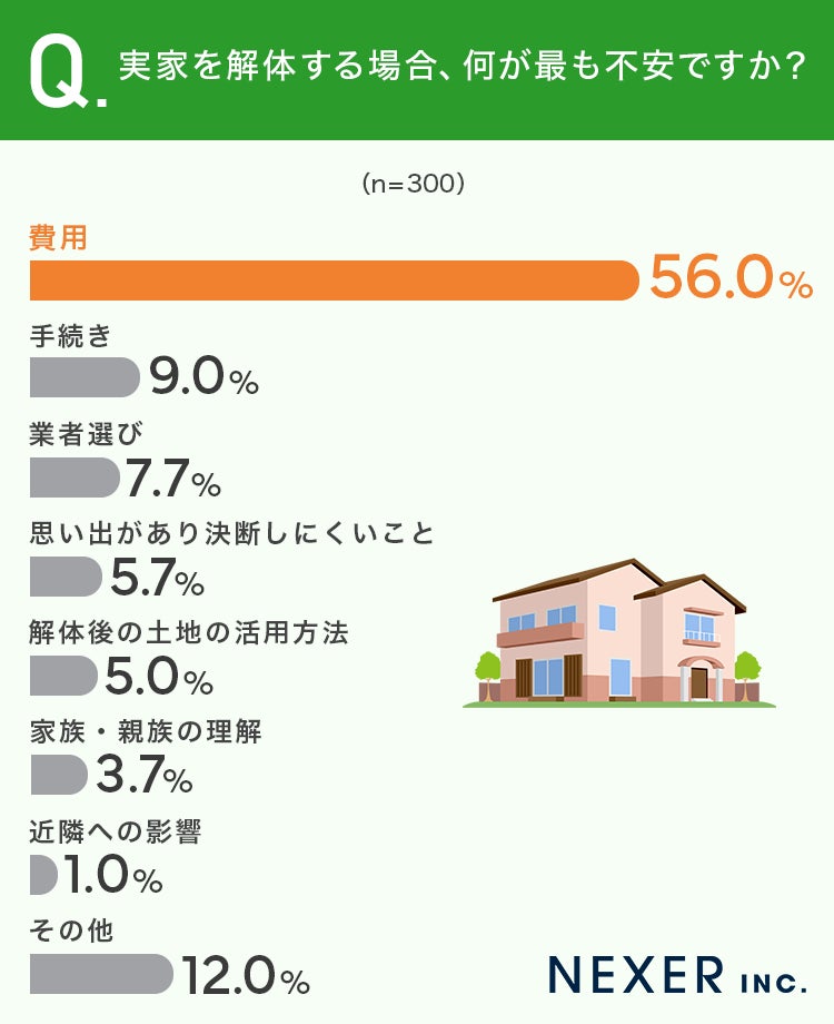 ■56.0%が、実家を解体する場合の不安として「費用」を挙げる