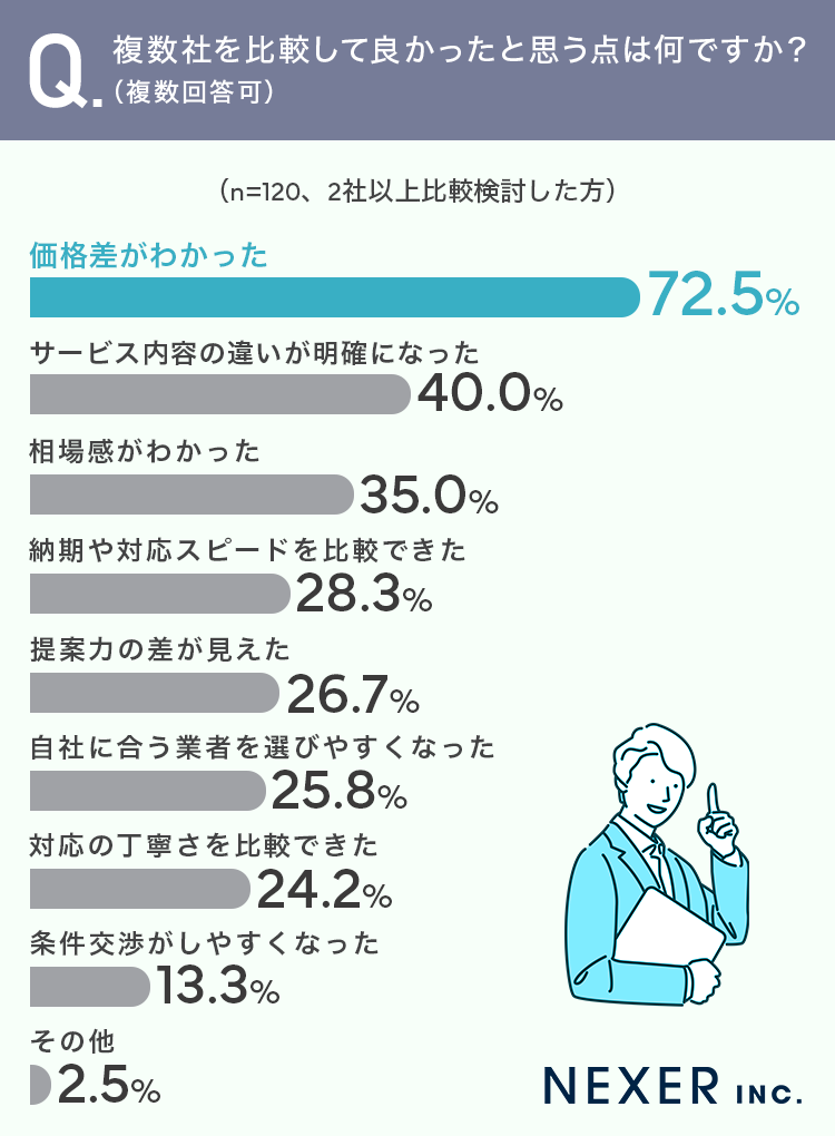 次いで「サービス内容の違いが明確になった」が40.0%、「相場感がわかった」が35.0%、「納期や対応スピードを比較できた」が28.3%と続きます。
