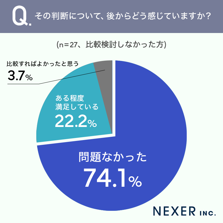 その結果「問題なかった」が74.1%、「ある程度満足している」が22.2%、「比較すればよかったと思う」が3.7%でした。