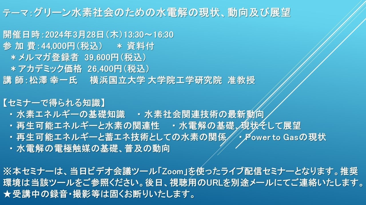【ライブ配信セミナー】グリーン水素社会のための水電解の現状、動向及び展望 3月28日(木)開催 主催:(株)シーエムシー・リサーチ