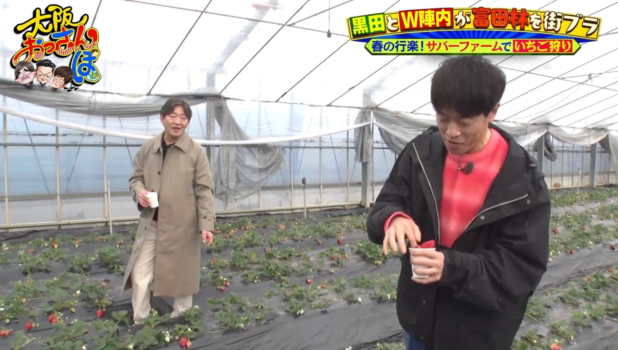 続いては体験型農業公園「サバーファーム」でいちご狩り。自分で摘んだいちごをパクリと食べて「うまい!」とご満悦の黒田だが、2粒食べただけでもう満腹に!? 「おっさんになって胃が動けへん。食が細くなって情けない……」とボヤく。