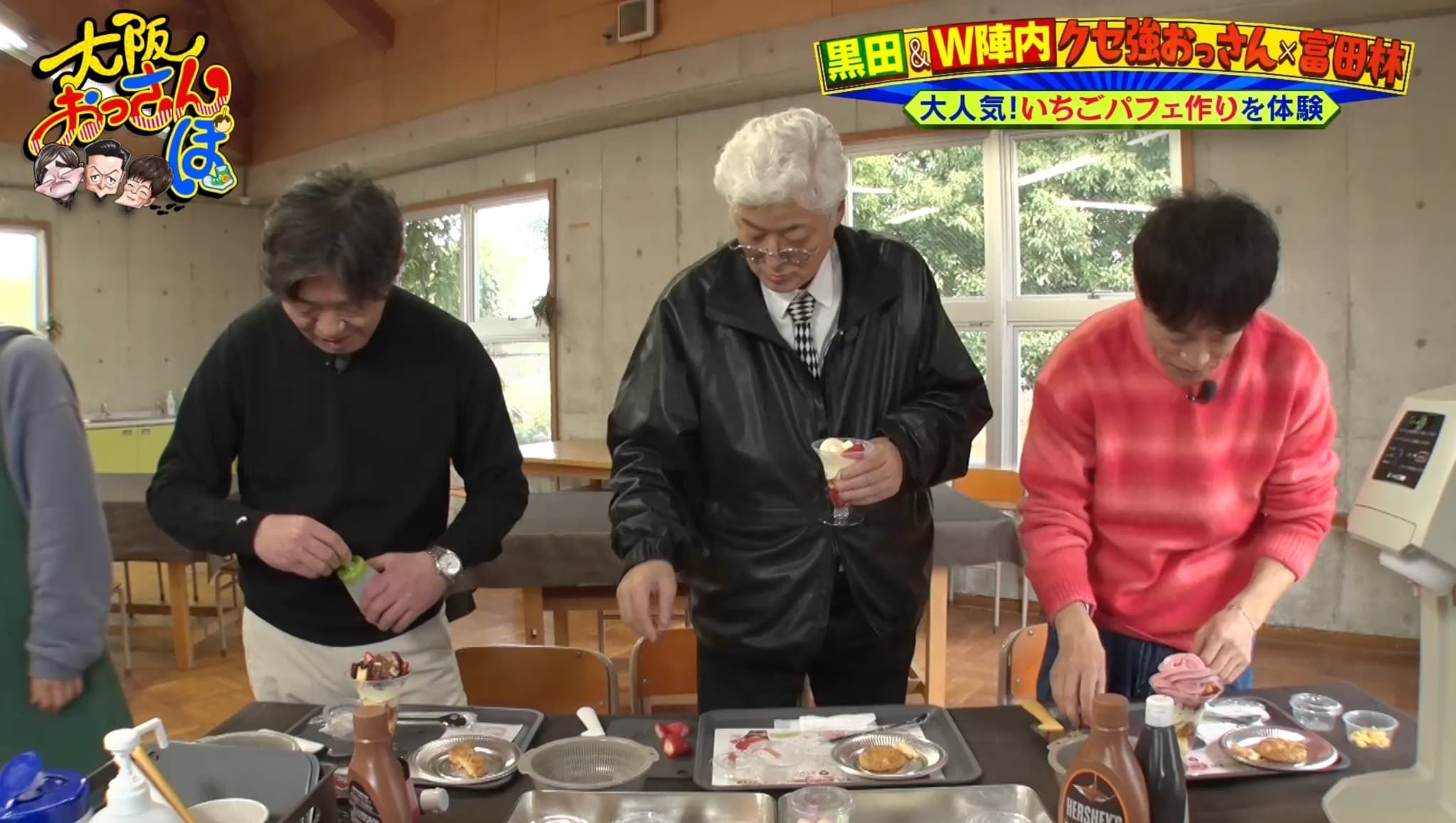 摘んだいちごを使った「いちごパフェづくり」も体験。「もう食べられへん……」と弱気になりながらも、いざ作り始めると大はしゃぎ。ソフトクリームを上手に巻けない孝則&智則に、黒田は「陣内という名は手先不器用なんちゃうか」とからかう。