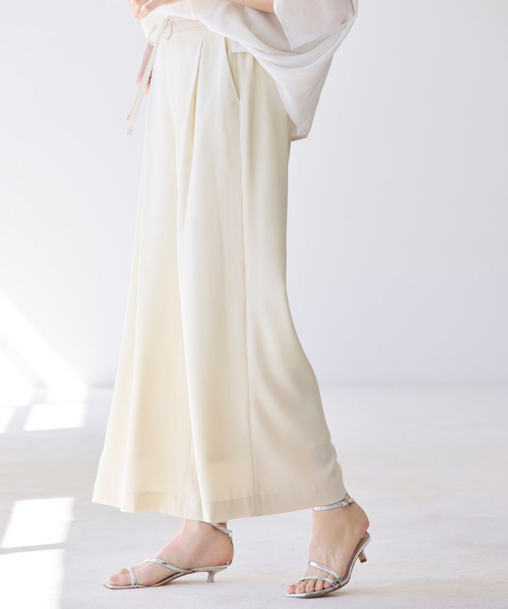 ウエストの華奢なリボンとゴールド金具でイージーパンツでもきれい見えが叶う大人のワイドパンツ。落ち感のある素材で作られたワイドシルエットは下半身をスッキリ見せ、スタイルアップも叶います。