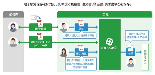 「SATSAVE」は、ペーパーレス化による書類の保存コスト削減、電子化・デジタル化による経理業務の効率化を実現するだけでなく、本認証取得により、お客さまが対応の検討を進める際に、電子帳簿保存法の電子取引に関する要件(改正電子帳簿保存法 第7条※2)の適合状況をチェックする必要なく、安心して導入することができます。