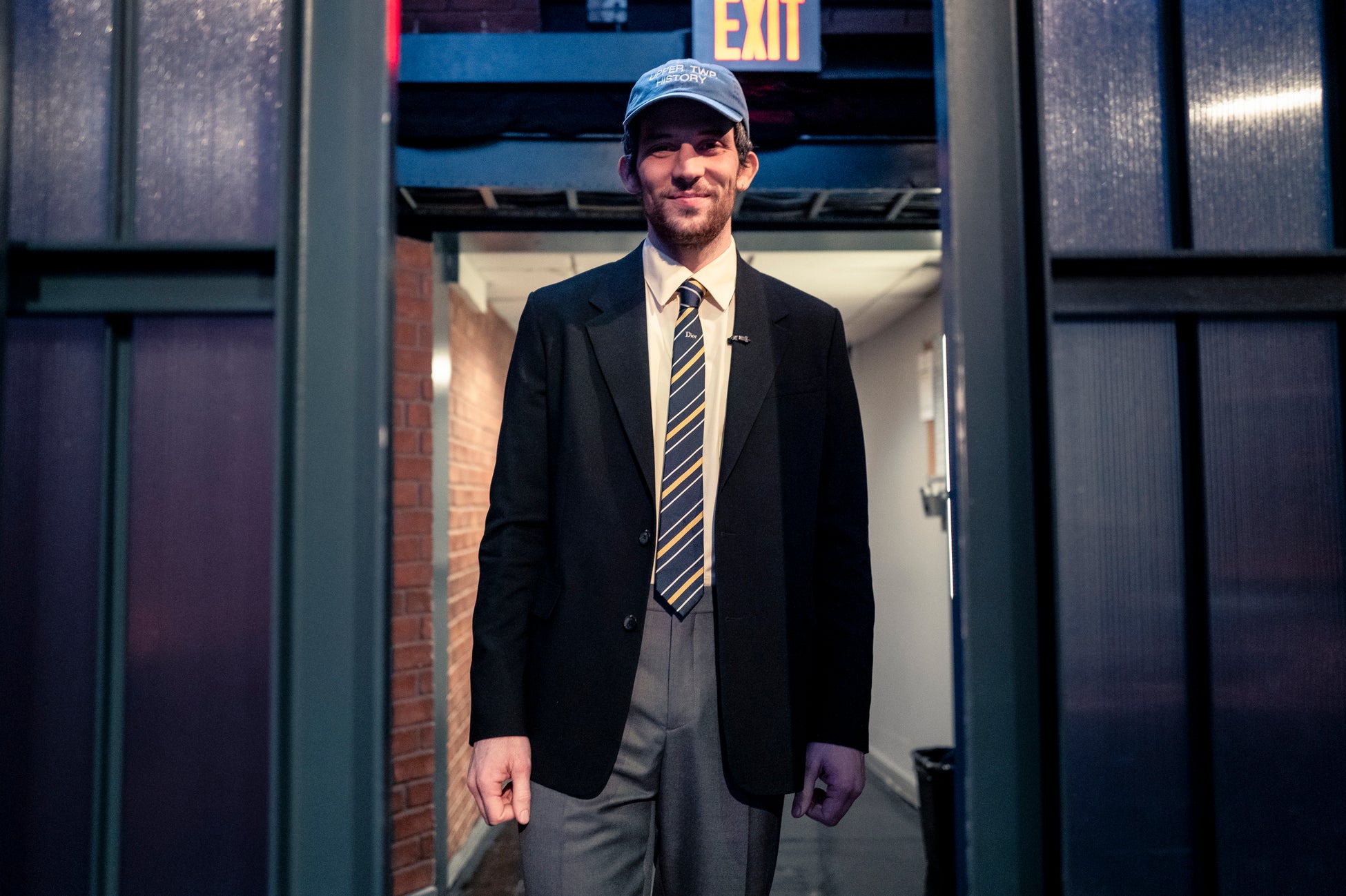 ジョシュ・オコナーはブラックウールのノッチドラペルジャケットに、クラシックなイエローのコットンシャツ、グレーのウールパンツを着用し、ネイビーとイエローのシルクストライプタイを合わせた装いを披露しました。