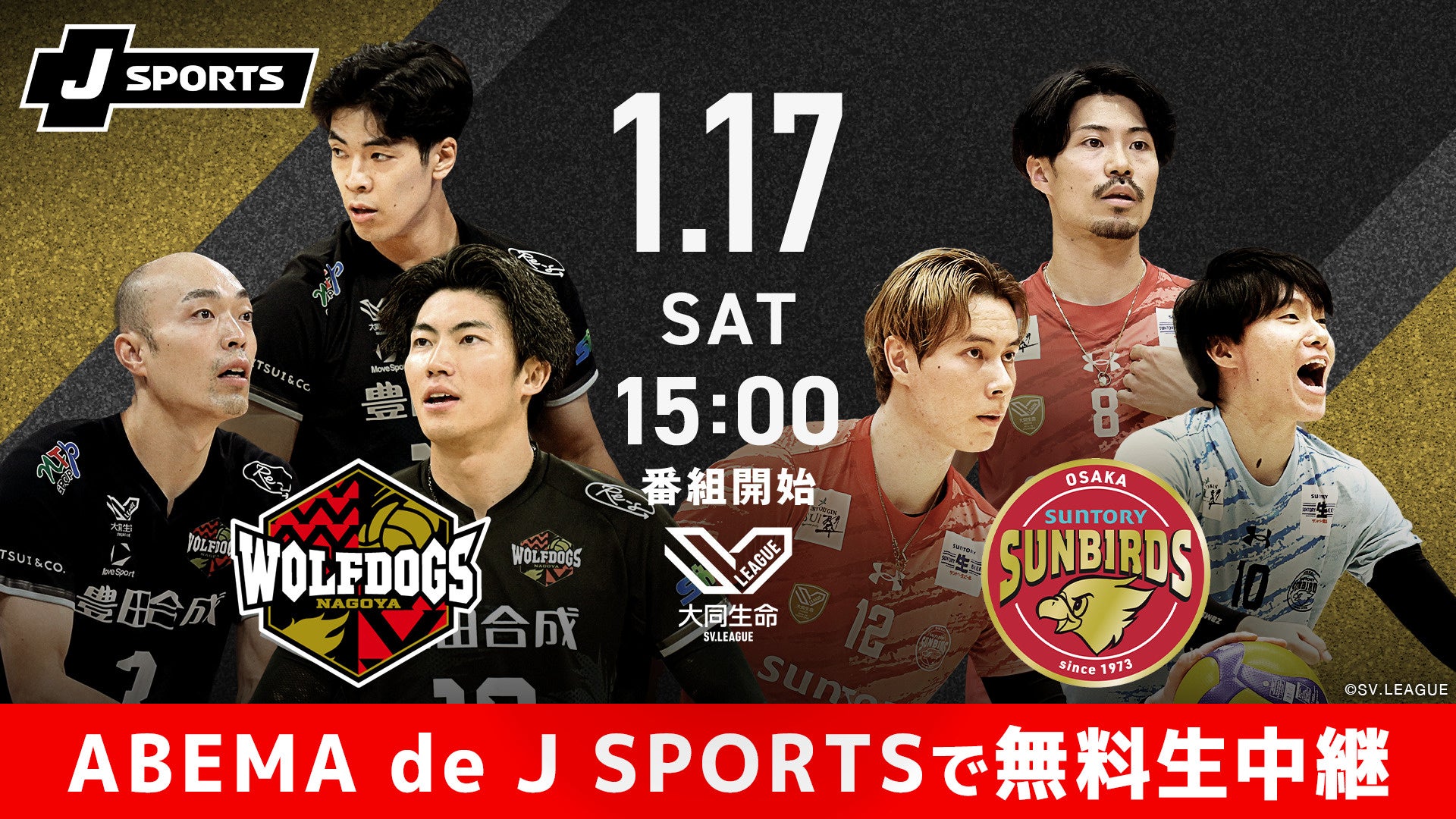 新しい未来のテレビ「ABEMA(アベマ)」は、J SPORTSのコンテンツを視聴できる「ABEMA de J SPORTS」にて、2026年1月17日(土)開催の2025-26 大同生命SV.LEAGUE MEN・第11節『ウルフドッグス名古屋 vs サントリーサンバーズ大阪』を無料生中継することをお知らせいたします。本試合には、バレーボール元日本代表の高松卓矢氏が「ABEMA」オリジナル解説として出演いたします。