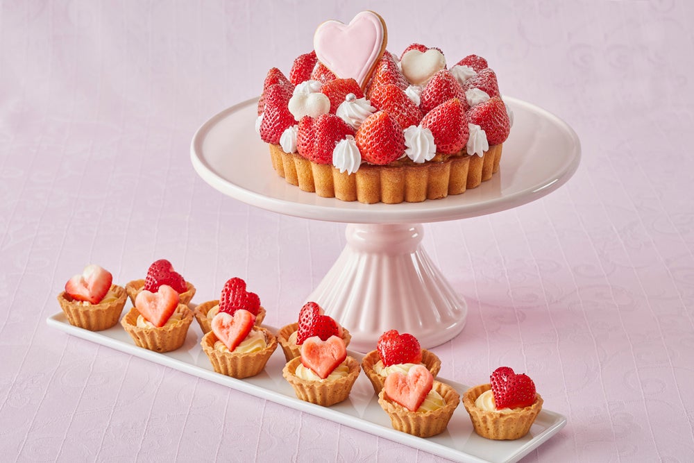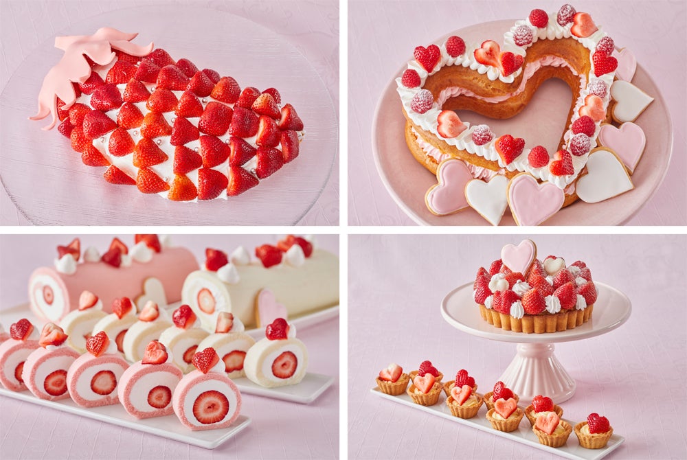 たっぷりの苺とクリームを使って大きな苺をかたどった「ストロベリージャンボオムレツケーキ」や、ハート型のシュー生地にストロベリークリームとミルクチョコレートクリームをサンドした「ストロベリークリスピーシュークリーム」をはじめ、タルトやロールケーキ、シフォンケーキなど、どれも旬の苺と、甘さ控えめでくちどけの良いホイップクリームを思いっきり楽しめるスイーツが勢ぞろい。パティシエによる実演コーナーでは、バターが香るサクサクのパイ生地で作る「赤い果実のミルフィーユ」や「ストロベリーパフェ」をご提供します。
