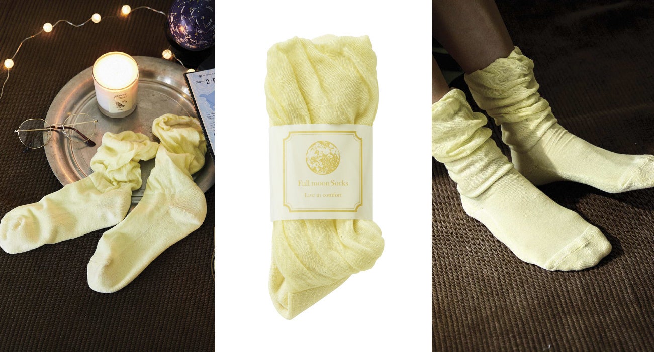 新月から満月へ月が満ちていくときに、からだをやさしくあたためたいときに使いたいという思いで作られた靴下です。肌なじみのいい内側シルク混で、むれにくく、快適さをキープできます。足首はふわふわしたガーゼで窮屈感なく、足底はシルク混のパイル編みでふかふかした履き心地です。