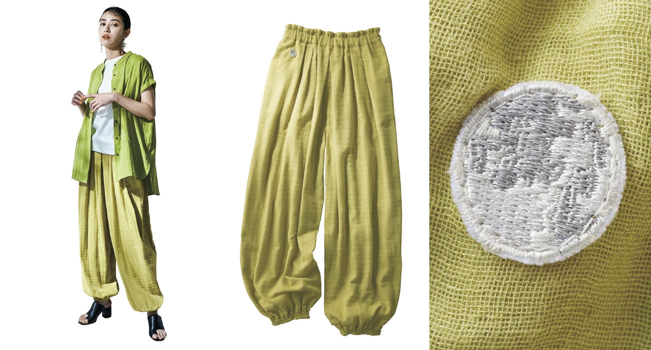 新月で始まったことが頂点に達し、花開く、そんな満月の日にぴったりのムーンライトイエローのぽんわりとしたシルエットのパンツです。表側はこなれ感のある綿麻素材、肌に当たる裏側はやわらかな綿100%のダブルガーゼ素材で、きれいさと着心地のよさを両立しています。ウエストには満月モチーフの刺しゅうワッペンが施されています。