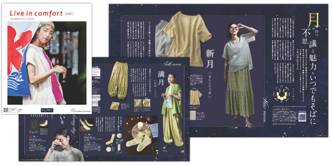 フェリシモが展開する、ファッションブランド「Live in comfort[リブ イン コンフォート]」は、月の満ち欠けにインスピレーションを受けた新作アイテムを発表、5月27日よりウェブ販売を行っています。新作は、新月をテーマにした「月明かりをまとうようなTブラウス」や、満月をテーマにした「ぽんわりパンツ」、「シルク混ガーゼソックス」など、月の不思議な魅力をいつでも身にまとうことができるアイテムです。新作アイテムは、特設サイトやデジタルカタログでチェックできます。