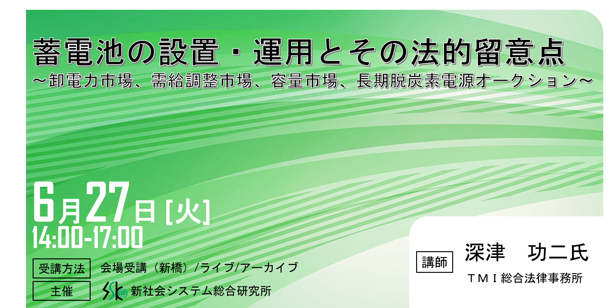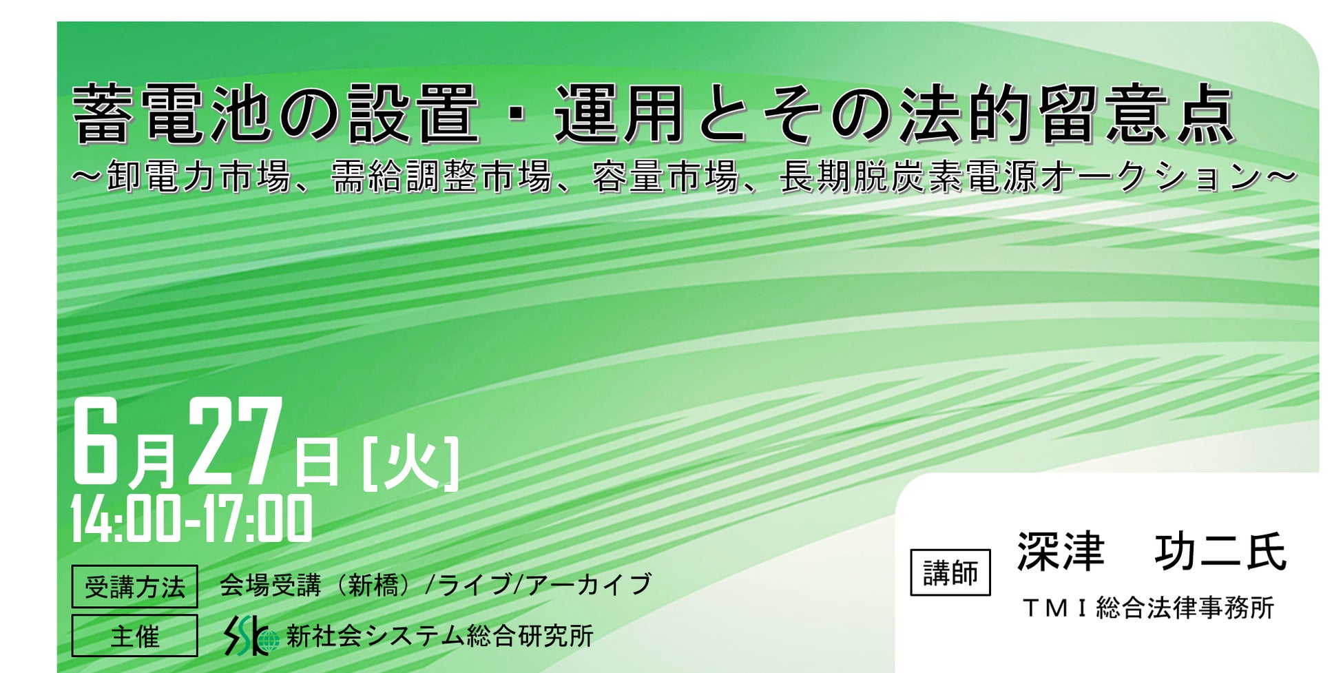 「蓄電池の設置・運用とその法的留意点」と題して、TMI総合法律事務所 パートナー 弁護士 深津 功二 氏によるセミナーを2023年6月27日(火)に開催!!
