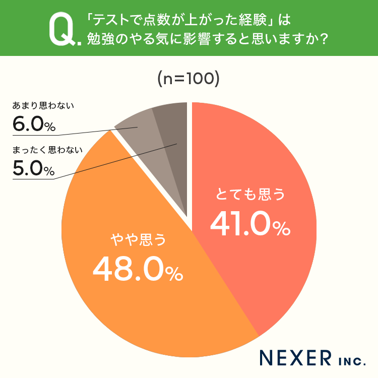 最後に、「テストで点数が上がった経験」は勉強のやる気に影響すると思うか聞いてみました。