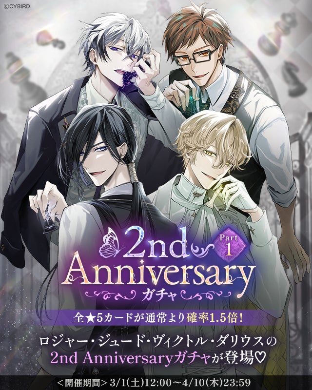 キャラクターデザイン担当の夏目レモン先生が描き下ろした、2周年記念ビジュアルが全12種の★5カードになって、期間限定2ndAnniversaryガチャに登場します。それぞれのPartによって登場する彼が変わるので、お見逃しなく!