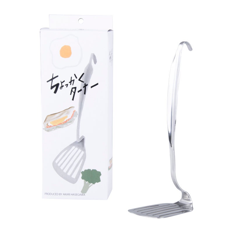 「ちょっかくターナー」は、長谷川あかり氏が日々”少ない調理ツールで様々な料理をつくりたい”というアイディアから生まれました。ターナーの柄とヘッド(返し)部分のつなぎ目が”直角”であることが特徴となり、”ひっくり返す・プレスする・マッシュする・すくう・油をきる”などの調理が、1本でできる便利な調理ツールです。