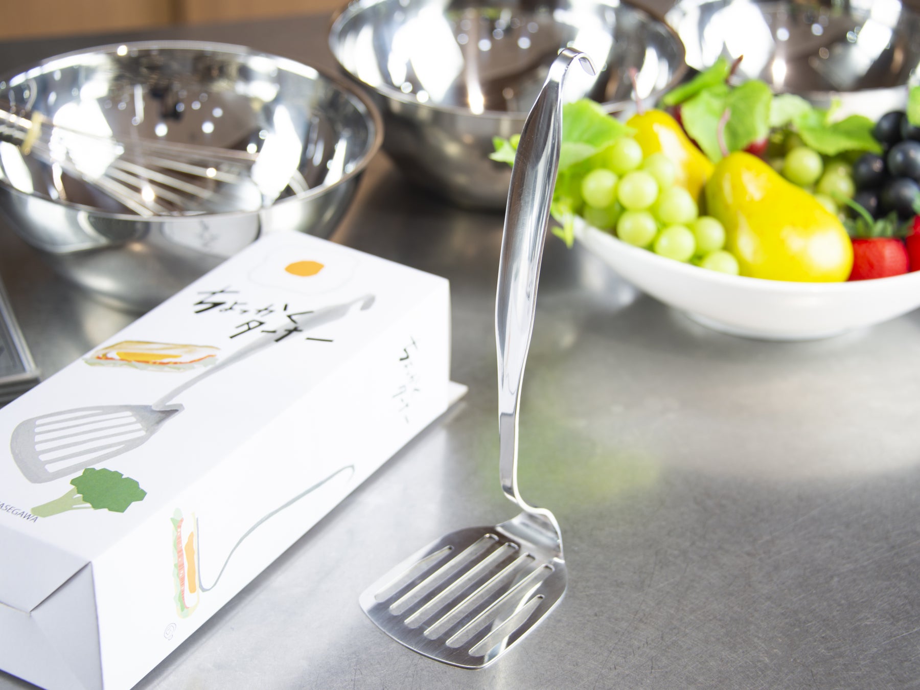 返す以外にも、プレスする・マッシュする・すくう・油をきるなどの調理が1本でこなせるターナーは、 ”少ない調理ツールで様々な料理をつくりたい”という長谷川氏の思いが詰まっています。